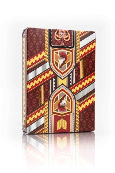 The deep maroon red soaks the cards and blends nicely with the light gold accents. The back cards are border-less with a fantastic fan display. Ace cards feature the knighted emblem in the center of the pips. See pictures below.