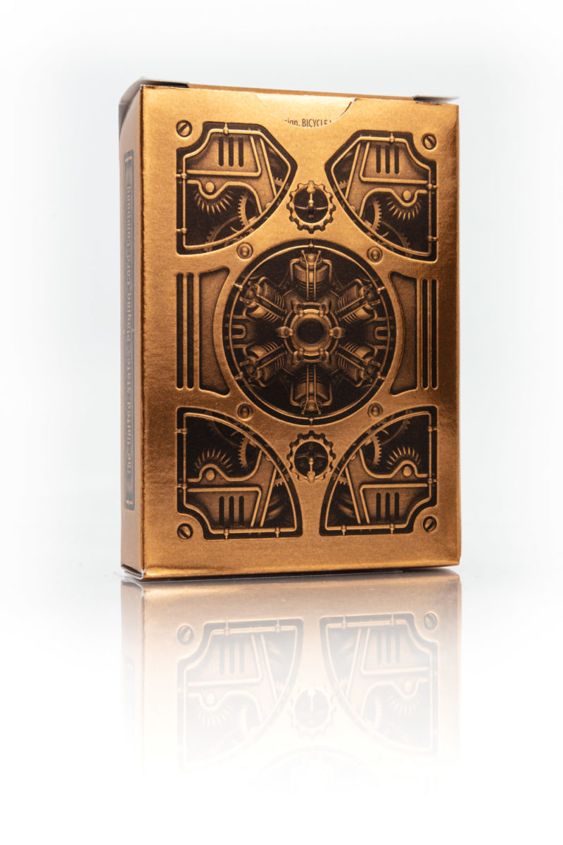 Ripped from the pages of science fiction, the gears are turning, the steam is pumping, and the playing cards were finally born. It wasn’t easy. The paper used on these tuck cases did NOT exist.
