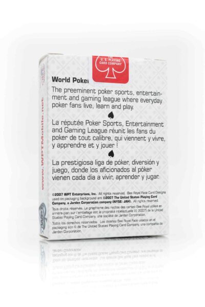 These are the playing cards used by the pros on TV’s World Poker Tour. They are made by Bee Club from the USPCC and are poker size. Stylish and in good quality. The backs of the cards are classic WPT diamonds with mirrored WPT logos. In Stock.