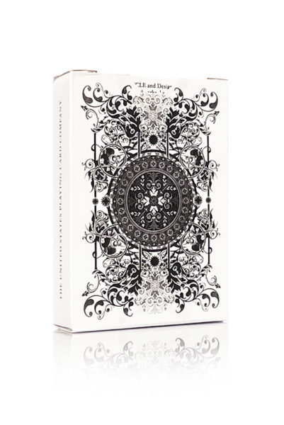 The design of the tuck case is a skull with that full gothic pattern, The theme of the deck is around the skull, revealing mystical, horror, and elegance. On the reverse side is the same vine patterns as on the back of the card.