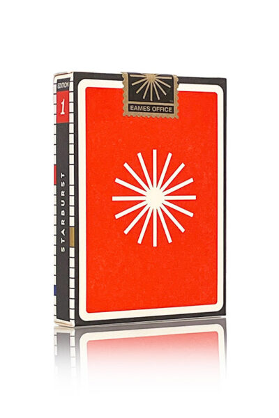 Our first edition of Eames Playing Cards showcases the Eames Office Starburst Logo on the backs. This iconic emblem was a recurring motif in the work of both Charles and Ray. Here it signifies their boundless creative energy-an explosion of light reaching for the outer limits of design’s true purpose. The unique numbering system on the faces of the cards enables acts of cardistry to function as subtle homages to the Eameses’ classic film “Powers of Ten.” The court cards honor the natural majesty they found in elemental geometric shapes. Mathematics, form, and the critical role of constraints in design are threads woven throughout the Eameses’ life and work.