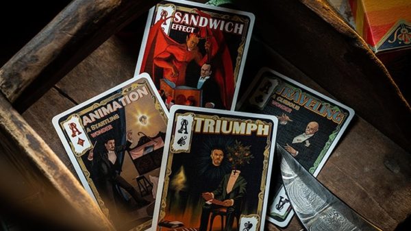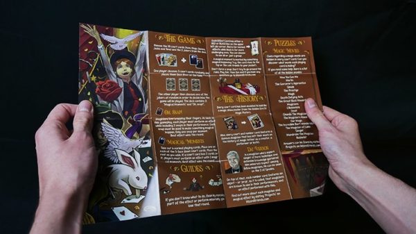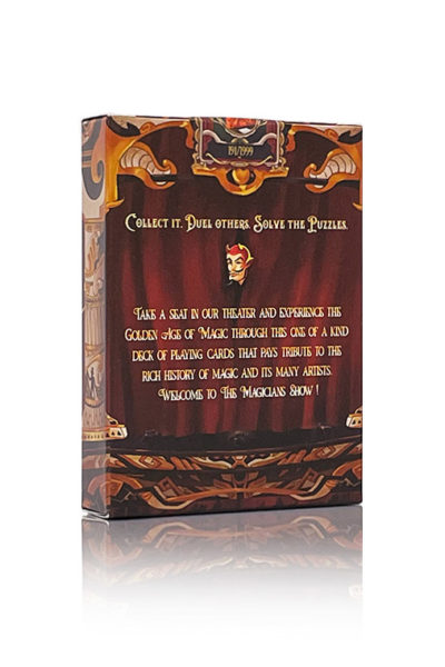 The embossed tuck case takes inspiration from a Victorian Era painting which showcases a devil playing cards with the magician on stage. On the inside of the tuck case you will find the names of all the backers who have helped make this project a reality.