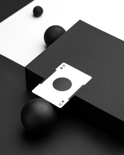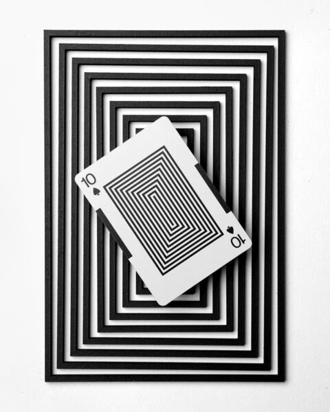 Eames ”Starburst” Playing Cards showcase the Eames Office Starburst Logo on the backs. This iconic emblem was a recurring motif in the work of both Charles and Ray. Here it signifies their boundless creative energy—an explosion of light reaching for the outer limits of design’s true purpose. The unique numbering system on the faces of the cards enables acts of cardistry to function as subtle homages to the Eameses’ classic film “Powers of Ten.” The court cards honor the natural majesty they found in elemental geometric shapes. Mathematics, form, and the critical role of constraints in design are threads woven throughout the Eameses’ life and work.