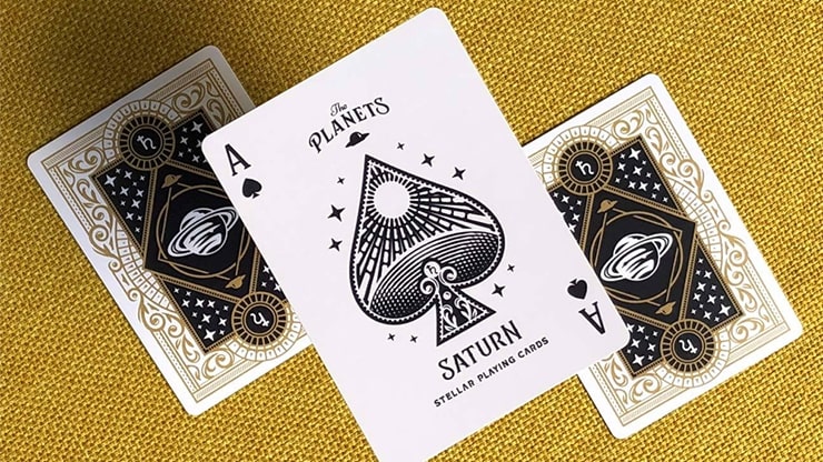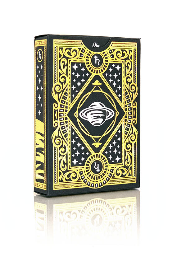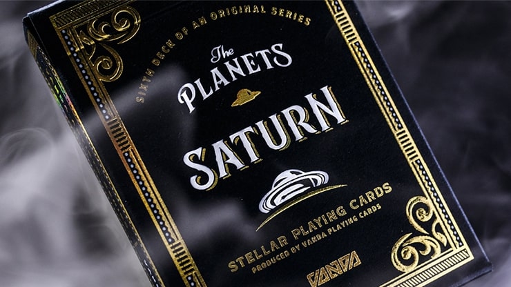 The Planets is a collection of decks representing the planets in our solar system, starting closest to the sun and moving outwards into the surrounding universe. The sixth deck of this series is Saturn. This is the most luxurious Vanda deck series to date, with tuckbox features that include gold holographic foil, white foil, interior foiling, and embossing. See pictures below.