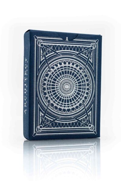 Designed by Jared Hansen and printed by the Expert Playing Card Company, the Architect Playing Cards is truly a sight to behold. The stunning tuck box is crafted from a heavy-duty deep blue matte paper that’s adorned on all sides with intricately applied silver foil.