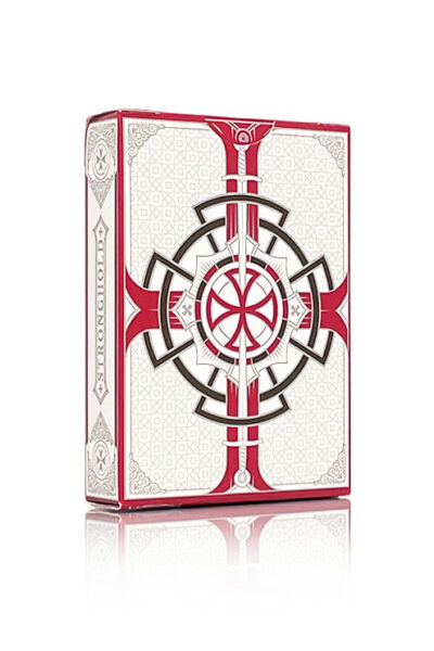 The purity of the knight spirit is reflected in a white background back where the cross and the sword, symbols from the Templar imagery, are depicted in silver and red in an elaborate symmetrical composition. That symbology is also present in both Jokers.