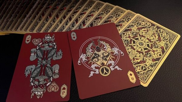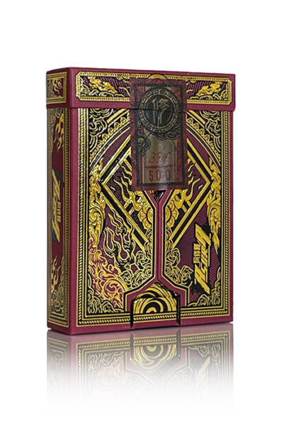 Asura Deluxe Red Playing Cards är en hyllning till mytologi och tidlös design, inspirerad av Asura-riket från hinduisk och buddhistisk kosmologi. Den här kortleken representerar teman som lust, konflikt och ambition och kombinerar traditionella spelkortselement med detaljerade, mytologiinspirerade konstverk. Bygger på grunden för Asura Classic Edition, deluxe-utgåvan introducerar premiumuppgraderingar som lyfter både den visuella och taktila upplevelsen, vilket gör den till ett enastående val för samlare som söker lyxigt hantverk och intrikata detaljer. 56 spelkort tryckta på högkvalitativt 330gsm tysk kartong med svart index med en slät smörfinish. Kallguldfoliering applicerad på både kortytor och baksidor skapar en slående, reflekterande finish som accentuerar det detaljerade konstverket. Guldfolieförgyllning längs kanterna ger en extra touch av elegans och sofistikering. Förpackad i en ”Fan of Display”-ask, tillverkad av premium bomullspapper, prydd med svart och guld foliering och 3D-prägling för att framhäva det invecklade i Asura-konstverket. Tillverkad av Card Experiment. Asura Deluxe Edition är en sann samlarpjäs som erbjuder en lyxig finish som blandar mytologi, konstnärskap och förstklassiga material.