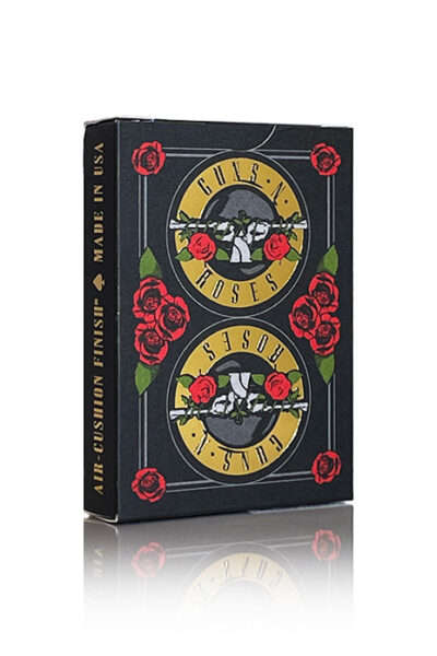 Bicycle Guns N’ Roses-spelkorten visar upp konstverk från GN’R:s ikoniska albumomslag Appetite for Destruction. Asken har guldfoliedetaljer, vilket ger en djärv och exklusiv touch.