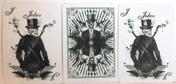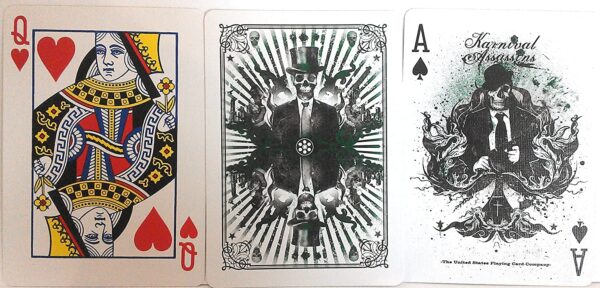 Den mest sålda Karnival-kortleken någonsin – ASSASSINS – släpps på nytt i en helt ny färg. En mörk och levande grön. Som med de ursprungliga Karnival Assassins får du en ny Karnival-stilad baksidedesign, Spaderess, Jokrar och ask. Bicycle Karnival Assassins kommer från BigBlindMedia och har den världsberömda USPCC-Air Cushion Finishen. Denna otroliga nya design i begränsad upplaga skapades av den kända franska konstnären Sam Hayles. En fantastisk(och super subtil) enkelriktad design. Se bilder nedan.