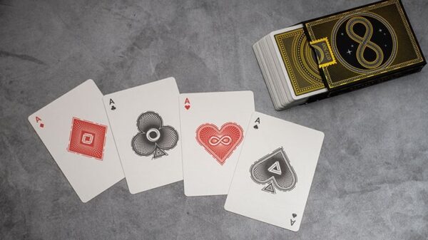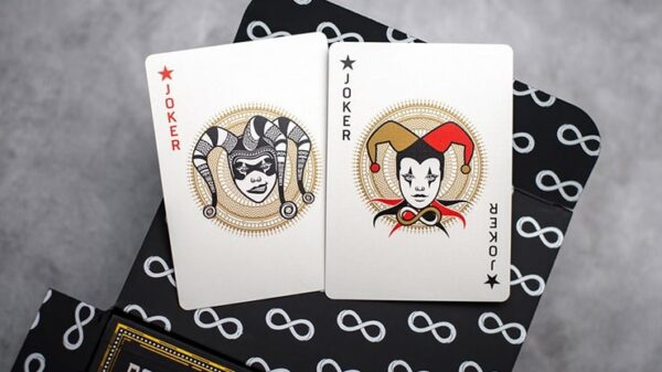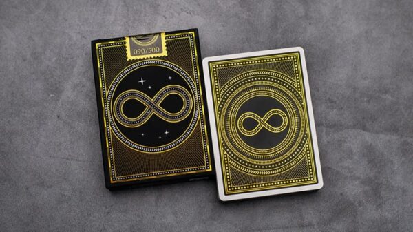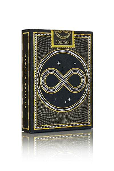 Detta är en ultrabegränsad specialutgåva av Continuum-spelkorten. Kortets baksidor har 100 % customgjorda konstverk och är tillverkade av svart bläck och guldfolie för en lyxig glans. De har en detaljerad geometrisk design med en oändlighetssymbol i mitten – som representerar oändliga möjligheter. Framsidorna är rena, moderna och har på de klädda korten inslag av metalliskt guldbläck. Nummerkorten har ett tydligt, minimalt utseende som passar för alla. Asken är gjord av ett lyxigt soft-touch matt svart papper med designen gjord av guld och vit folie. Den är toppad med ett individuellt numrerat folieklistermärke. Continuum har UltraLux™-finish och AquaFlow™-beläggning. Den europeiska kartongen av kasinokvalitet har en perfekt linnestruktur som hanteras som en absolut dröm. Korten är traditionellt skurna med släta kanter som ger precis lagom grepp. Tryckta med vegetabiliskt bläck och vattenbaserad beläggning, korten är också miljövänliga. 2 st gaffkort ingLimiterad upplaga, 500. Se bilder nedan.