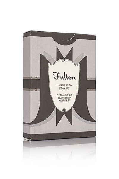 ”Den viktigaste kunden är den som inte kan tala för sig själv.” – Daniel Phillips, begravningschef. Designad av Brad Fulton baserad på hans kärlek till begravningsbyråer i vintagestil, söderns kyrkogårdar, art déco och mer specifikt – kombinationen av dem båda. Fultons Funeral innehåller en tidlös design som håller i evighet. De svartstrukna kanterna på korten hyllar Victorian Mourning Stationary. Jokrarna har konst av Charles Allen Gilbert, ”All is Vanity” – en klassisk optisk illusion och kommentar om det mänskliga tillståndet. En kortlek utan dess like. Endast från Mind of Fulton. Begränsat till 700 kortlekar tryckta av US Playing Card Co. Se bilder nedan.