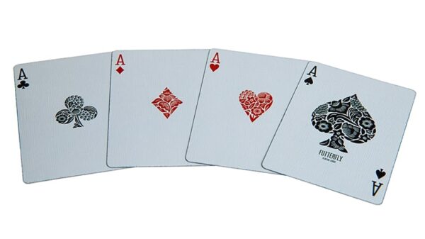 ”Såg du mitt senaste framträdande på Penn & Teller: Fool Us? Om så är fallet kanske du har märkt att Butterfly-korten jag använde hade en svart kant runt sig, speciellt utformade för att lura programledarna. Jag hade tryckt 30 oförgyllda kortlekar i Kina bara för den här föreställningen och hade aldrig för avsikt att kanttrycka dem. Men när jag väl hade sett hur fantastiska de svarta kanterna såg ut på Black & White-kortleken, insåg jag hur vansinnigt bra det skulle se ut på dessa Fool Us Decks… Den svarta bården som går ut över kanten… Underbart! Så här är de, de nya Futterfly-spelkorten. De är kanttryckta med djupsvart färg med hjälp av ny kantutskriftsteknik utvecklad av Cartamundi och deras partnerföretag i Frankrike. Kanttrycket skyddar inte bara kvaliteten på korten, utan det förstärker också förpackningens magiska egenskaper och skyddar mot fukt och handfukt som så ofta försvagar okanttryckta kort längs deras sårbara kanter. Futterfly-lekarna innehåller 54 kort och en doublebacker. De är tryckta av Cartamundi på Slimline Card Stock med True Linen B9 Finish. Dessa kort är inte märkta vilket också gör dem lämpliga för kortspel. Se bilder nedan.