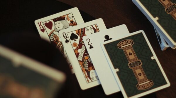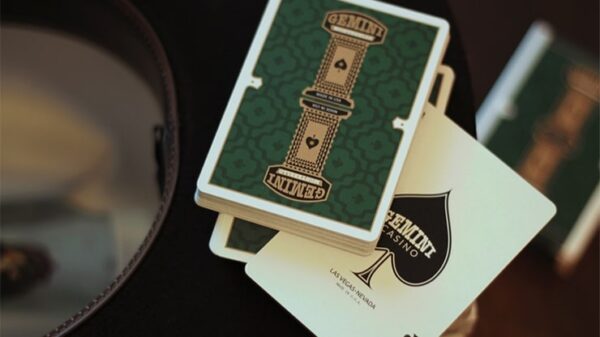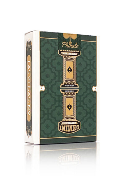 Gemini Casino Phthalo Green med ny elegant design på baksidan och Arrco-framsidor som gör att denna kasinokortlek ser ännu mer lyxig och vintage ut än tidigare. Denna vackra gröna färg kompletteras perfekt av vinröda och mörkgula färger på de klädda korten. Begränsad upplaga av 1000 kortlekTraditional Cut. Duplikat av ruter kung. Tillverkad av The United States Playing Card Company. Designad av Toomas Pintson. Se bilder nedan.