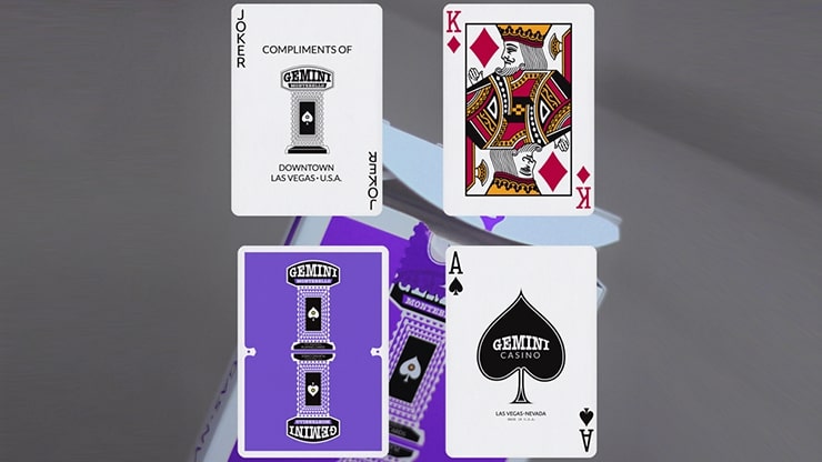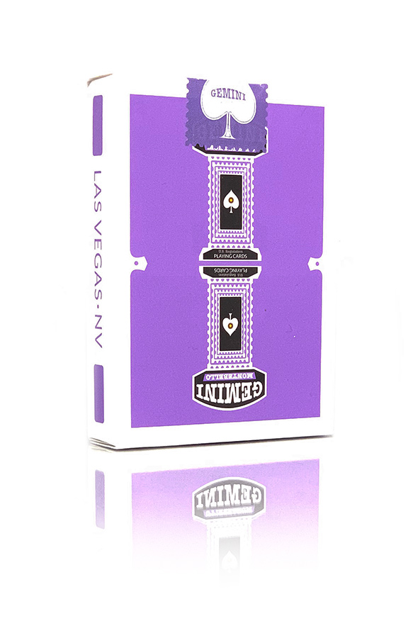 Limited Edition. Endast 1100 tryckta. Gemini är ett fiktiv kasinokortlek inspirerad av inspirerad av klassiker som Jerry’s Nugget och Dunes Casino-spelkort. Gemini Casino Purple Playing Cards har skapats för att se ut som en vintagekortlek som du kanske hittar i ett gammalt Las Vegas lager från 70-talet. Tryckt av USPCC. Designad av Toomas Pintson. Se bilder och film nedan.