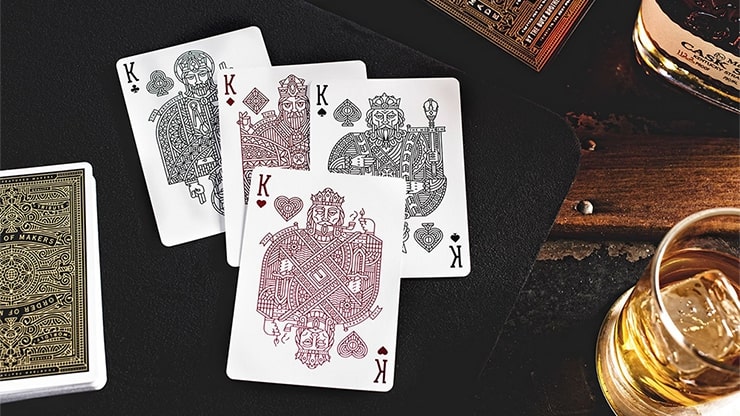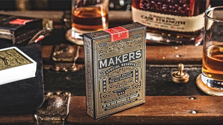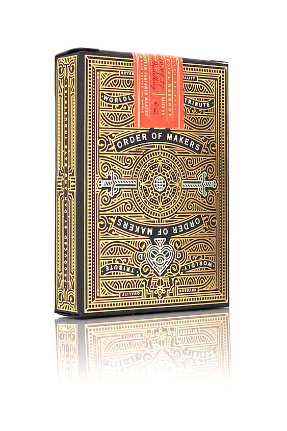 Lyxiga spelkort gjorda av The D&D Playing Card Co. Makers Blacksmith Edition är den mest intrikata och lyxiga kortleken från Dan & Dave. I likhet med de ursprungliga Makers som släpptes i grönt, har denna nya svarta några uppdateringar av framsidorna och en ny interiör i asken i guldfolie. Varje ask har präglats och stämplats med lager av guld- och silverfoliering. Resultatet är inget annat än hisnande. Makers trycks av USPCC. Thin crushed stock. Se bilder nedan.