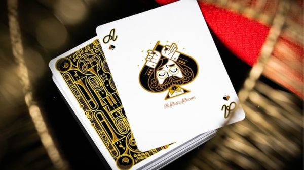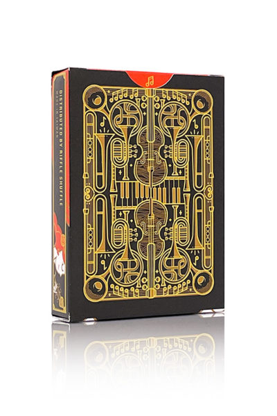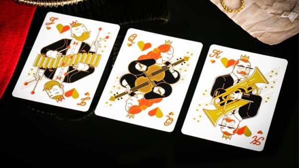 Kom och följ med oss för den fantastiska showen fylld av melodiska harmonier skapade av instrumenten från våra vackra Orchestra Playing Cards. När du blandar dem kommer du att vara mycket nöjd med de musikaliska ljud som dessa kort kan göra. Kombinationen av dessa ljud och det graciösa konstverket på de klädda korten, som var och en representerar olika instrument som finns i en verklig orkester, kommer att få dig att känna dig som om du faktiskt var publik inför en orkester. Asken och annonskorten har noterna från ett melodiskt stycke som finns i musikalen Joker’s Game, så skaffa en kortlek och spela igenom den. Orchestra Playing Cards är tryckta av TWPCC med deras legendariska lager. Begränsad till 2000 kortlekar.