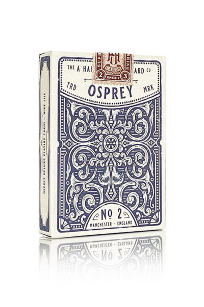Med handritade konstverk i vintagestil, är denna klassiska blå kortlek tryckt av Legends PCC på deras Crushed Stock med klassisk finish. Inrymd i en mjuk matt ask tryckt på insidan med ett heltäckande antikt plädmönster. Inspirerade av den majestätiska fågeln med samma namn är Osprey No 2 Vintage Spelkort en syn att skåda. Hela kortleken, inklusive framsidor, index, och baksidor har ritats från grunden. Tillsammans med Goshawk Vintage Playing Cards bildar de en blå och en röd kombo av kortlekar.