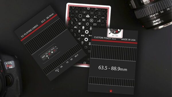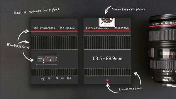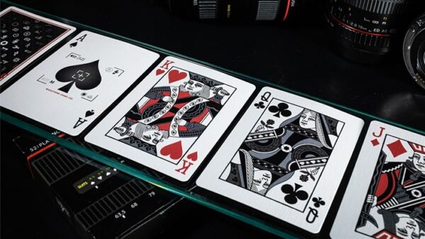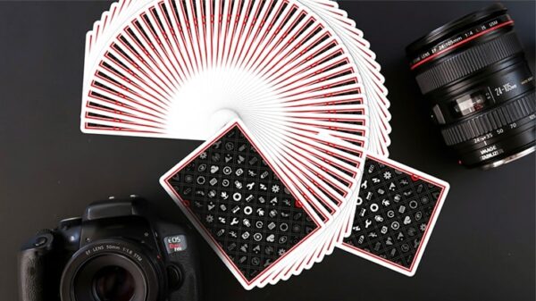Limited Edition, 500. Numrerat sigill. Från det holländska Card House Company kommer Shooter f/1.2, en uppsättning spelkort som kombinerar passionen för professionell fotografering och ren grafisk design. Tryckt av USPCC. Kortleken är ett samarbete med Matt Fujiwara och efterliknar på ett briljant sätt kamerans estetik. Kortens baksidor har ikoner som alla kameraägare och fotografer kan hitta och känna igen. Klassiska ikoner som, batterinivåvisning, inställningar, ljusstyrka, blixt eller självutlösare, för att bara nämna några. Den röda ramen skapades för att behålla det ”röda ringen” -temat i hela kortleken. Rött metalliskt bläck finns på baksidan och på kortens framsidor. Tre versioner tillgängliga: Black workers deck – Crushed STock. Vit specialutgåva – Ask med prägling och 2 -färgs folietryck. Svart specialutgåva – Ask med prägling, 2 färgat folietryck och numrerad försegling. Se bilder nedan.