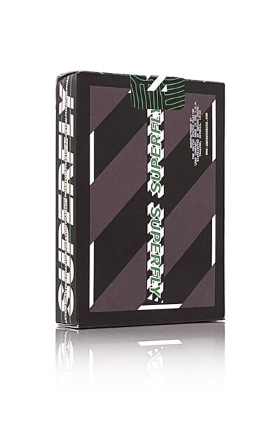 Superfly Phantom med svart, grå och grön ”Phantom”-baksida, designad av Toomas Pintson. Vacker mörk kortlek för cardistry och korttrick. Denna kortlek innehåller halvt customgjorda klädda kort och 1 double backer. Begränsad upplaga av 1100 kortlekar. 2 jokrar. Tillverkad i USA av The United States Playing Card Company. Se bilder nedan.
