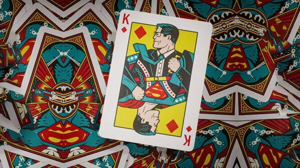 Premiumspelkort inspirerade av serierna från Stålmannens guldålder. Tillverkad i Amerika. Inspirerad av DC Comics guldålder är Superman Playing Cards en hyllning till den första superhjälten någonsin, klädd i den klassiska stilen i vintage Action Comics-serien. Med helt customgjorda konstverk, premiumprägling och utsmyckad med Supermans livfulla färger – varje kortlek är förseglad med ett frimärke direkt från postrummet på Daily Planet. Stålmannen, det första framträdandet av Superman publicerades i Action Comics #1 1938. Det var i detta ögonblick som superhjältar föddes och födde seriernas guldålder. Varje kortlek är tillverkad i USA. ”Dedikerad till sanning, rättvisa och den amerikanska vägen.” En bättre morgondag. Alla dina favoritkaraktärer. Dina favoritkaraktärer väcks till liv, inklusive Clark Kent/Superman, Lois Lane, Supergirl, Jor-El, Lara Lor-Van och Jimmy Olsen – tillsammans med ikoniska skurkar som Lex Luthor, Darkseid, General Zod och Brainiac! Vi kan inte heller glömma hans pålitliga följeslagare Krypto the Superdog, och trickstern Mr. Mxyzptlk!