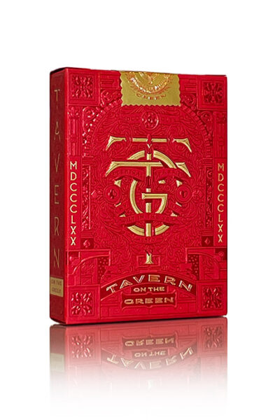 En ny begränsad upplaga av Tavern on the Green, med en rik röd baksida, prydd med kunglig guldfolie. Limited Edition. Den här nya begränsade upplagan av Tavern on the Green Playing Cards har några av de mest intrikata detaljerna på en ask som vi någonsin har producerat. Inifrån och ut lyser varje detalj. Utsökt prägling och ultrarik folie skapar en aura som bara tillhör Tavern. Ett konstverk – inifrån och ut. Med customdesign av Kevin Cantrell, inklusive baksidor, ess, jokrar och klädda kort – med slående guldfolie på kortets baksidor och framsidor.