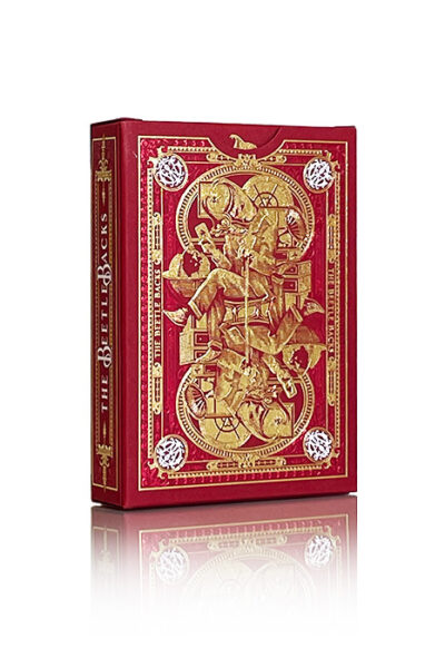 Med all den elegans som kännetecknar sekelskiftets stil har Beetle Backs Crimson Edition vackert präglad ask med 3 folielager tryckta på högkvalitativ 310 g/m² kartong. Korten inuti har en klassisk speglad baksida i livfulla och iögonfallande färger som gör dem perfekta för magi eller kortspel. Metalliska Pantone-bläck finns på baksidorna och framsidorna av Crimson Edition. Beetle Backs, presenterade av The Gentleman Wake och designade av Widakk Design, är kulmen på ett tvåårigt arbete med att skapa en kortlek som är perfekt för samlare, spelare och magientusiaster överallt. Klassisk och vacker, med stil och elegans från sekelskiftet och de finaste moderna hanterings- och tryckteknikerna för spelkort, berättar Beetle Backs också den kafkaiska historien om en hårt kämpande entomolog som är djupt försjunken i studier av sitt valda område; underfamiljen Dynastinae av skarabébaggar. För spelare, samlare och magientusiaster är Beetle Backs en mästerlig kollektion av kortlekar; en perfekt förening av klassiskt inspirerad illustration och modern design, mästerligt tillverkad med material av absolut högsta kvalitet och noggrannhet i detaljerna. Kortleken är förpackad i premiumförpackning prydd med upp till tre folielager och djup prägling.