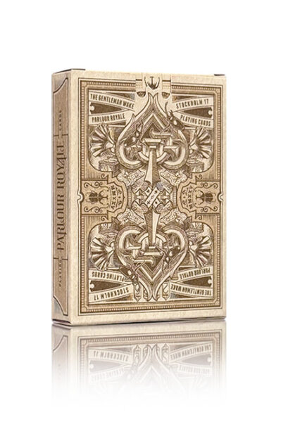 Parlour Royale Ivory Edition, presenterad av Gentleman Wake och designad av Stockholm17, har en vackert präglad ask i fyra färger med en slående uggla och skalbagge som spader ess. Omgivet av detaljerad och utsmyckad typografi och med starka anspelningar på den viktorianska stilen som inspirerade kortleken. Perfekt för samlare, spelare och magientusiaster. Klassisk och vacker, med stil och elegans från sekelskiftet och de finaste moderna teknikerna för hantering och tryck av spelkort. Med fantastiska tryckta kort med vermilionkant som smälter perfekt in i kortaskens röda insida. Korten är tryckta på 310 g/m² slätt papper med linnefinish och glänser lysande med guldfärgad kallfolie.