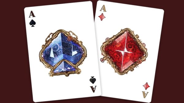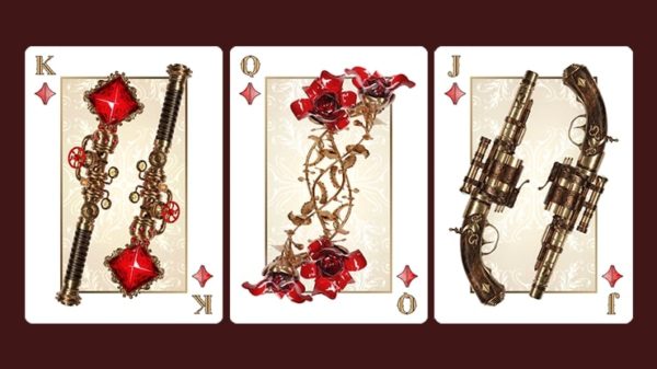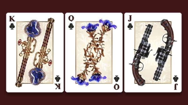 Staden Coriolis är en juvel mitt i ödemarken. En ledstjärna för civilisation, kultur och gott liv. När allt kommer omkring, finns det en anledning till att vi ofta blir överfallna av vilda nomader, ivriga att plundra våra skatter och underverk. Men de vackraste städerna har sina mörka sidor, och Coriolis är inget undantag. Symbolen för denna ambivalens är vårt berömda kortspel. Det är en visuell juvel som bär symbolerna för de makter som delar administrationen av staden, men också de material som utgör den; trä, stål, kristall. Visste du förresten detta faktum? Om i det höga samhället ses kortspelet som ett trevligt tidsfördriv -ibland tillsammans med imponerande satsningar, i de lägre distrikten används det ibland som ett vapen. När vissa använder en pistol eller en dolk, har andra utvecklat en dödlig disciplin av kortkastning och använder sina skräckinjagande kanter som rakhyvlar. Så, vilken typ av spelare ska du bli? En fredlig kung, en visdomsdam eller en legosoldat? Valet är ditt! Kortleken Victorian Playing Cards Steampunk Edition är en ny design baserad på den tidigare framgångsrika viktorianska kampanjen. Den består av femtiotvå kort och två jokrar. Projektets huvudidé är att ersätta de traditionella hovkorten med symboler: spira för kungen, ros för drottningen och pistol för knekt. Övriga kort förblir som vanligt. Huvudfärgerna på indexen är guld för de röda och mörkbruna för de svarta. Korten är spegelvända så att de ser likadana ut upp och ner med undertextskillnader. Kortleken kommer i två versioner. Skillnaden ligger inte bara i färgen på asken – GULD eller SILVER, utan också i designen för ess och jokrar. Funktioner: 52 kort och 2 jokrar. Högkvalitativt tryck på kort, 310 gsm premium tyskt linnekartong. Tryckt av NPCC 330gsm silver och guld spegel italiensk kartong för asken. Präglade detaljer på asken. Inre tryck på asken.